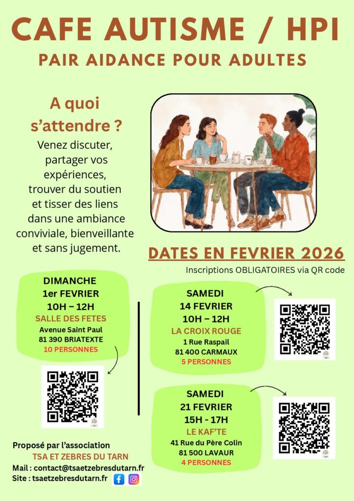 Trois cafés autisme se tiendront à Briatexte, Carmaux et Lavaur en février 2026.